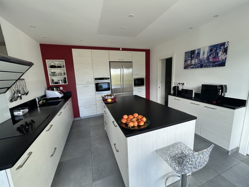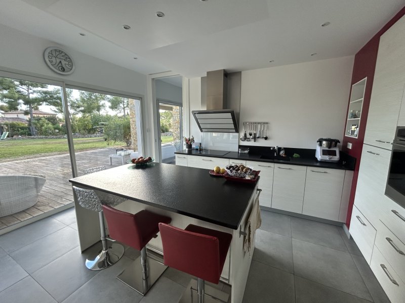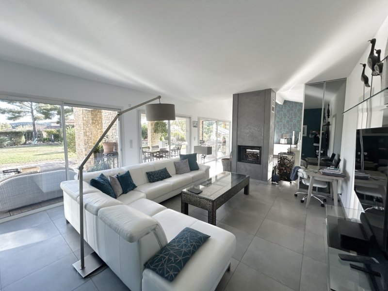 La Cadière d'azur - Située dans un secteur très recherché, calme et lumineux, cette villa contemporaine de 232 m2 offre des prestations haut de gamme et un cadre de vie exceptionnel. Dès l'entrée vous serez accueillis par un hall majestueux avec une grande hauteur sous plafond. Le séjour-salon baigné de lumière grâce à de grandes baies vitrées s'ouvre directement sur les terrasses et le jardin. Une cheminée-insert vient parfaire l'ambiance chaleureuse de la piéce. Cuisine équipée donnant sur une belle salle à manger. Côté nuit, 7 chambres au total. De plain-pied, trois chambres avec leur salle d'eau privative et un bureau. A l'étage, une suite parentale spacieuse avec dressing et salle de bains. Une cinquième chambre avec sa salle d'eau compléte cet étage. Annexe indépendante de 40 m2 avec 2 chambres et petite piscine privative. Sur un superbe terrain de 5 000 m2 agrémenté de nombreux oliviers, offrant charme et tranquillité. Vous profiterez d'une piscine privée de 10 x 5 avec abri haut amovible , sans vis-à-vis, parfaite pour les beaux jours. Grand sous-sol avec vaste garage pour plusieurs voitures, atelier et cave à vin. Pompe à chaleur pour chauffage par le sol et climatisation réversible. Panneaux solaires