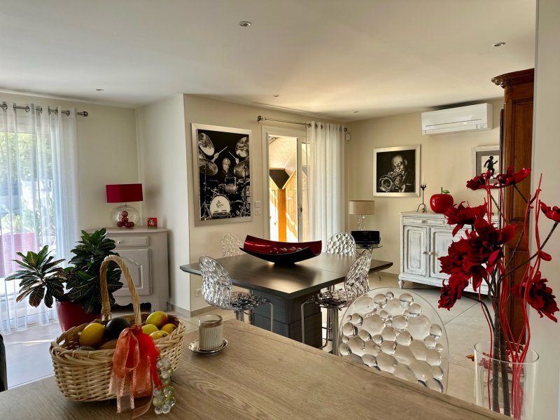 À vendre Maison rénovée haut de gamme à Sainte-Marguerite, La Garde (83130) L'agence Quadrimmo vous présente en exclusivité une magnifique maison entièrement rénovée, située dans le quartier prisé de Sainte-Marguerite à La Garde, à proximité immédiate du Pradet, des plages et de toutes les commodités. Cette villa contemporaine de 150 m2 habitables, édifiée sur un terrain paysager de plus de 500 m2, offre un cadre de vie privilégié où confort, modernité et élégance se conjuguent parfaitement. Espace de vie Le séjour traversant exposé plein sud bénéficie d'une luminosité exceptionnelle grâce à ses larges ouvertures donnant sur le jardin. L'ensemble est sublimé par une cuisine ouverte moderne et entièrement équipée, un poêle à bois design, ainsi qu'un système de climatisation réversible pour un confort optimal toute l'année. La pièce de vie s'ouvre sur une grande terrasse et une piscine entourée de verdure, idéale pour profiter d'un cadre paisible et sans vis-à-vis. Agencement intérieur Rez-de-chaussée : Deux belles chambres lumineuses Une salle d'eau contemporaine avec douche à l'italienne et matériaux haut de gamme Une troisième pièce aménagée en dressing et buanderie, pouvant être transformée en bureau Étage : Espace modulable climatisé avec rangements et point d'eau, offrant la possibilité de créer deux chambres supplémentaires, une suite parentale ou un espace de travail Un garage fonctionnel complète ce bien aux prestations soignées. Atouts et prestations Rénovation complète et haut de gamme Climatisation dans toutes les pièces Piscine et terrasse plein sud Environnement calme et résidentiel Aucun travaux à prévoir Proximité immédiate des commerces, écoles et plages Informations complémentaires Bien situé en lotissement (charges ASL : 150 EUR/an) Taxe foncière : 2 650 EUR Prix de vente : 700 000 EUR, honoraires inclus à la charge de l'acquéreur (10 000 EUR) Les risques auxquels ce bien est exposé sont consultables sur le site www.georisques.gouv.fr. Pour tout renseignement ou pour organiser une visite, contactez dès aujourd'hui l'agence Quadrimmo au 04 94 21 03 10.