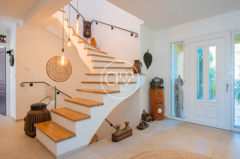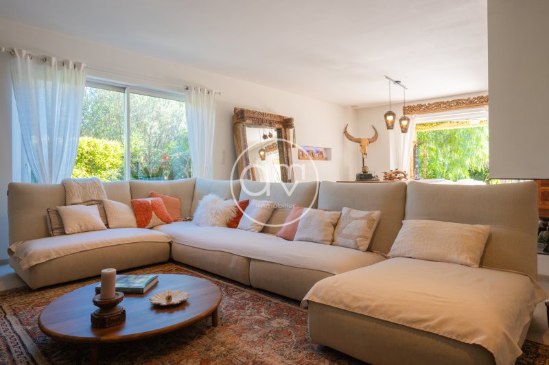 Au bout d'une impasse s'ouvre le portail de la demeure que nous sommes fiers de vous présenter aujourd'hui, sur une parcelle de 774 m2. Une entrée arborée invite à entrer dans un immense salon avec cheminée de 60 m2, le tout bordé de larges baies vitrées avec vue sur le jardin et la piscine. Aucun vis à vis ne saurait exister. Une terrasse abritée prolonge cet espace, parfait pour s'y délasser ou prendre l'apéritif entre amis. La cuisine ouverte de 22 m2, bénéficie également d'une terrasse plein Sud, pour des déjeuners ensoleillés. La suite parentale de plain-pied avec sa salle d'eau et son dressing constituent, avec un bureau, l'espace privé indépendant du rez-de chaussée. Un escalier d'architecte, aux allures aériennes vous emmène au premier étage, constitué de quatre belles chambres et d'une salle de bains. L'escalier descend également au sous-sol, qui accueille un garage de plus de 80 m2, ainsi qu'une pièce de 61 m2 aménageable en espace bureau ou en salle de jeu; l'aménagement de chambres est également possible. Le niveau se poursuit avec une buanderie et une salle d'eau WC. Comme évoqué, une piscine de 9m par 4m, entourée d'une verdure luxuriante et d'une terrasse en teck, infuse une douceur tropicale qui confère à la propriété harmonie et élégance. Un studio indépendant (24 m2) au niveau du rez-de-chaussée, termine de parfaire l'ensemble.