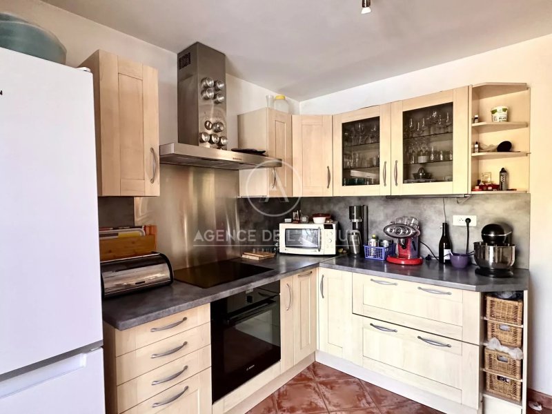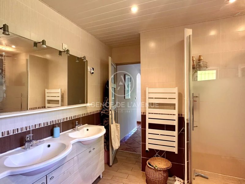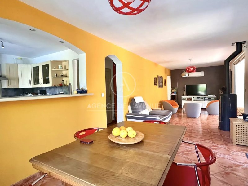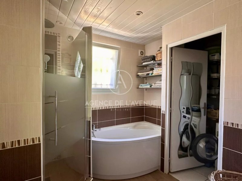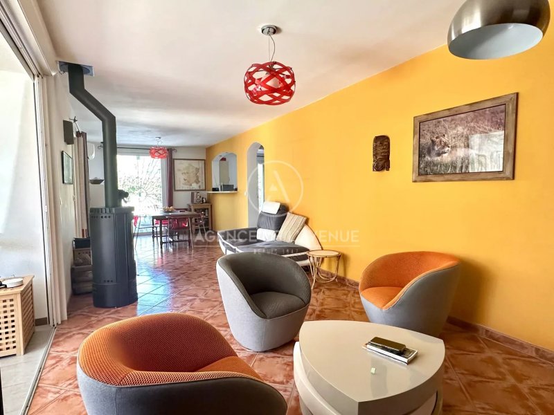 Edifiée sur un terrain de 630m2, cette maison familiale entièrement climatisée se compose au rez-de-chaussée d'un salon séjour avec poêle à bois, cuisine semi ouverte équipée, une salle de bains avec douche et baignoire, un wc, un cellier et une buanderie
