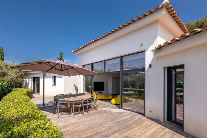 Le Beausset o Calme absolu en fond d'impasse o Proximité immédiate du village Nichée au bout d'une impasse confidentielle, cette villa de 2017 conjugue lignes épurées, volumes généreux et prestations haut de gamme. Entièrement de plain-pied, elle déploie 170 m2 habitables baignés de lumière grâce à une hauteur sous plafond de 3,40 m et de larges baies vitrées ouvrant sur de somptueuses terrasses en bois exotique. Points forts : Espace de vie d'exception Séjour-salon de plus de 60 m2, atmosphère traversante, accès direct aux terrasses et à la piscine. 4 chambres, dont 2 suites parentales Suites équipées de dressing et salle d'eau privative ; deux autres chambres se partagent une salle de bain familiale. Terrain plat de + 1 200 m2 Entièrement paysagé, arrosage automatique, aire de stationnement et garage fermé. Piscine 13.5 X 5.5 M Bassin contemporain sécurisé, plage immergée et vaste deck en bois exotique Convivialité & loisirs Terrain de pétanque intégré, espaces lounge ombragés, terrasses orientées sud/ouest pour profiter du soleil couchant. Confort moderne Chauffage et rafraîchissement par pompe à chaleur, menuiseries aluminium à rupture de pont thermique, volets roulants motorisés, éclairage LED intérieur/extérieur. Environnement privilégié Adresse rare au Beausset : calme absolu, aucune nuisance, mais commerces, écoles et marché provençal accessibles à pied. Idéale pour une famille recherchant une maison clé-en-main, facile à vivre, ou pour des résidents secondaires souhaitant un pied-à-terre haut de gamme proche des plages de Bandol et du circuit Paul-Ricard.