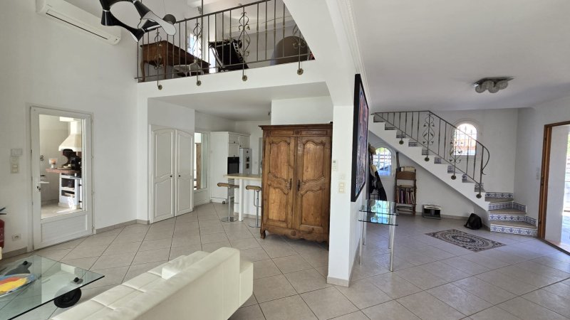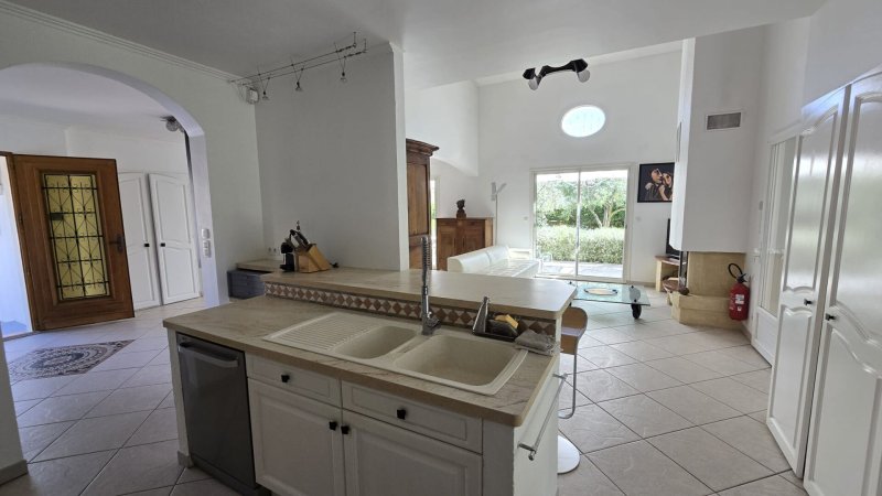 Sur un beau terrain arboré de 1000m² avec piscine, très belle villa de 138M² comprenant de plain-pied une grande entrée, un vaste séjour-salon donnant sur deux terrasses dont une couverte avec cuisine d'été, une veranda bibliothèque, une cuisine ouverte entièrement équipée avec buanderie, trois chambres, wc et salle de bains.