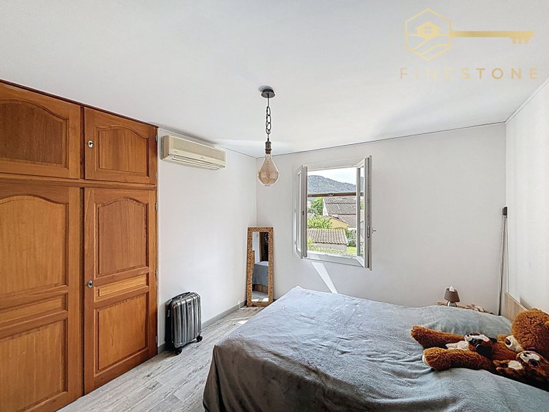 Édifiée sur un terrain de 452 m², elle offre un bel espace de vie agrémenté d'un poêle à granulés et d'un système de climatisation pour un confort optimal en toutes saisons.