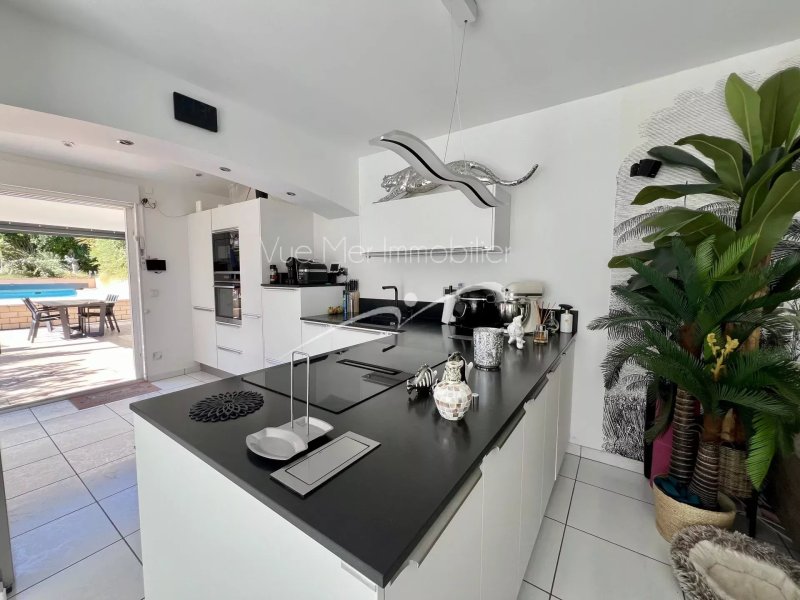 ◦ Grand séjour lumineux avec cuisine ouverte de 42m2 , donnant directement sur la terrasse et la piscine grâce à une baie vitrée à galandage. Pergola bioclimatique.