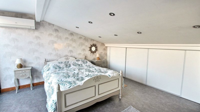 À l'étage, une vaste mezzanine offre de multiples possibilités d'aménagement : bureau, espace détente et/ou coin lecture selon vos envies. Vous y découvrirez également deux chambres équipées de placards, une grande salle d'eau avec WC, ainsi qu'une superbe terrasse tropézienne, à l'abri des regards, offrant une vue dégagée sur la plaine des Maures, un véritable havre de paix.