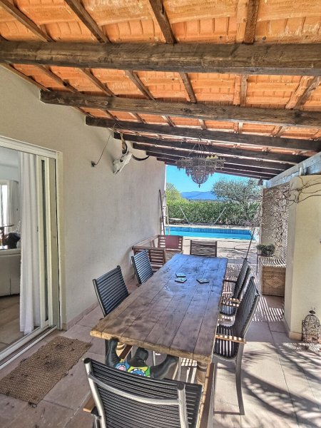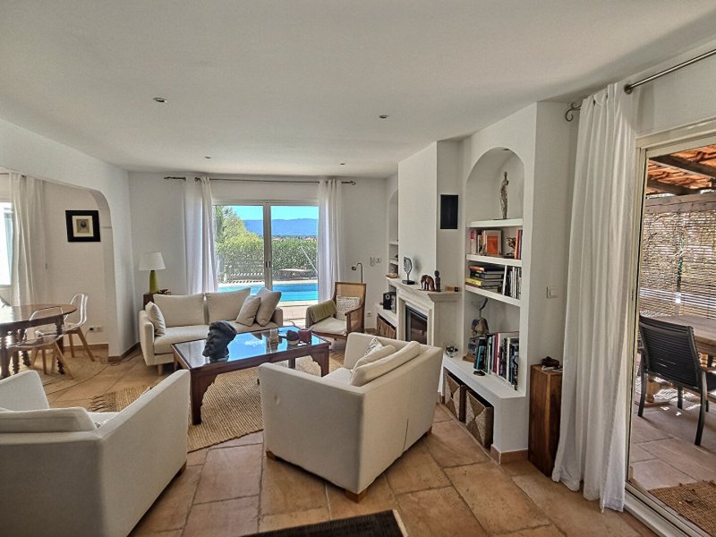 À l'extérieur, le terrain aménagé et arboré s'organise autour de trois terrasses aux différentes expositions (sud, ouest, nord) et d'une piscine avec ses plages offrant une vue dégagée sur les Maures, plein sud.