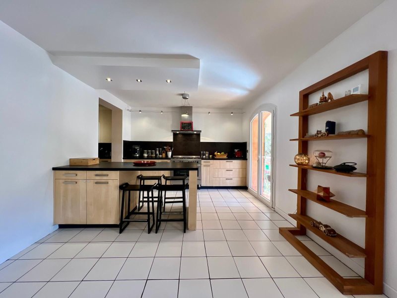 Dans un environnement calme et recherché, cette belle maison familiale de 182 m2 offre de beaux volumes, pensés pour le confort et la fonctionnalité. Elle comprend au rez-de-chaussée un vaste séjour-salon de plus de 50 m2 avec grande cuisine équipée, une arrière cuisine ainsi qu'un bureau et un atelier. A l'étage, 4 belles chambres, nombreux espaces de rangement, une salle de bains avec douche et baignoire et une suite avec salle d'eau privative. Le confort est assuré par un chauffage au sol et une climatisation gainable à l'étage. A l'extérieur profitez d'une grande terrasse couverte de 42 m2 exposée plein Sud, d'une seconde terrasse en bois et d'un jardin arboré d'oliviers sur un terrain de 860 m2 piscinable. Côté annexes, la maison dipose de 2 grandes caves sur une surface de 80 m2, ainsi que d'un garage de 25 m2 avec porte automatique. Plusieurs stationnements possibles intérieurs et extérieurs.