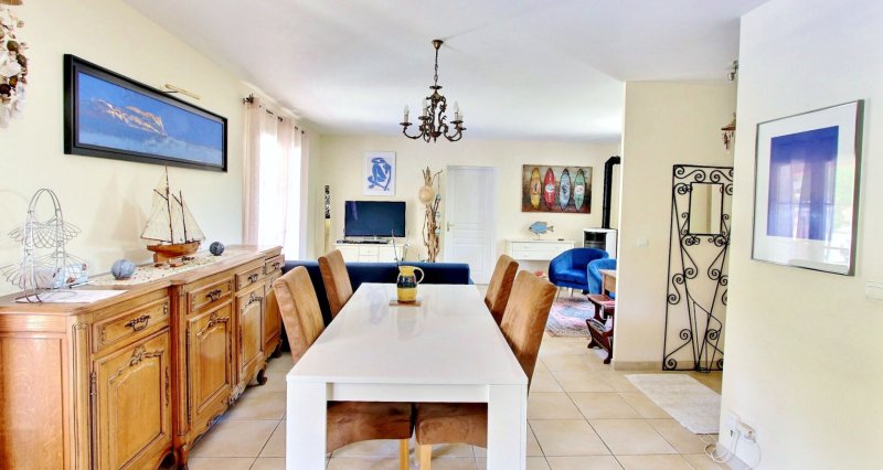 Dès l'entrée, vous serez séduit par la luminosité et l'ambiance chaleureuse du salon/séjour climatisé, sublimé par un poêle à granulés pour vos soirées d'hiver. La cuisine ouverte, entièrement équipée, invite à la convivialité et s'ouvre sur une belle terrasse ombragée.