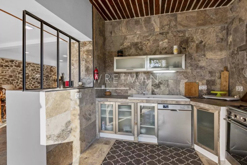 Le charme de l’ancien a été conservé tout en intégrant un confort haut de gamme : poutres apparentes, murs en pierre d’époque, portes d’abbaye anciennes, menuiseries aluminium, chauffage central, isolation intégralement refaite.