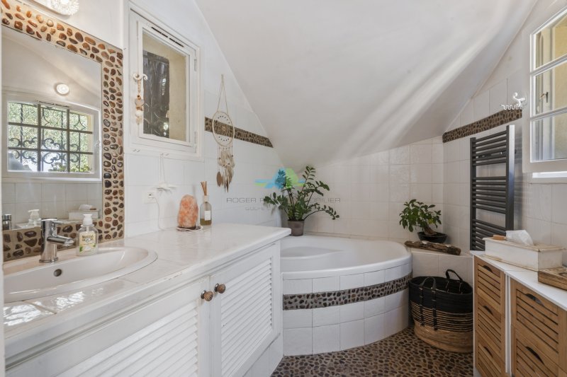 Vente villa Les Issambres. Proche des plages et du village de SAN PEIRE LES ISSAMBRES , belle vue mer pour ce beau Mas provençal style Hacienda, construite en Pierre de taille et enduit , sur 2 niveaux d'env 275 m2 habitables édifiée sur une parcelle de 2018 m2 complantée de Pins maritimes et d'essences méditérranéennes . bon ensoleillement et située à 1 km 200 environ du centre de San Peïre et plages Construction d'une piscine possible Elle comprend : A l'Etage : villa principale qui se compose : Hall d'entrée, vestiaire et wc invités, double séjour avec cheminée, salle à manger, cuisine indépendante aménagée , office , buanderie, 3 chambres dont 1 avec sa salle de bains et wc, les 2 suivantes avec salle d'eau et wc plus 1 wc séparé. un PATIO avec petit bassin menant à une chambre indépendante avec sa salle d'eau et wc. Au Rez de jardin : Appartement 3 pièces indépendant : Séjour, cuisine ouverte aménagée , 2 chambres, salle de bains avec wc, salle d'eau avec wc Garage , Abri 3 voitures et cave à vins. Beau potentiel , véritable havre de paix...