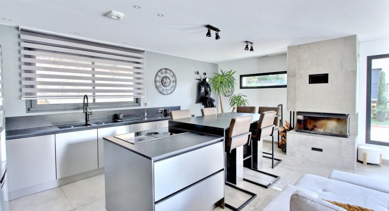 Dès l'arrivée, l'architecture séduit par sa façade claire et ses larges ouvertures panoramiques en aluminium, baignées de lumière. À l'intérieur, la pièce de vie impressionne par son atmosphère résolument design, sublimée par une cheminée en béton minéral et une superbe cuisine dinatoire de chef en inox, entièrement équipée, pensée pour les amateurs de gastronomie et de convivialité.
