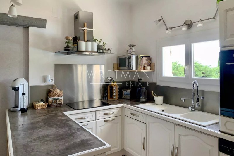 Vous trouverez une authentique porte d'entrée qui vous mènera vers un hall s'ouvrant sur un salle à manger avec poêle à bois, puis dans le salon avec cheminée et une belle hauteur sous plafond, des portes fenêtres donnent sur la terrasse et la piscine. Dans le salon se trouve une mezzanine qui peut être utilisé comme espace bureau. Sur le même niveau se trouve une cuisine avec buanderie, et deux chambres dont une avec coin douche, dressing et terrasse privée.
