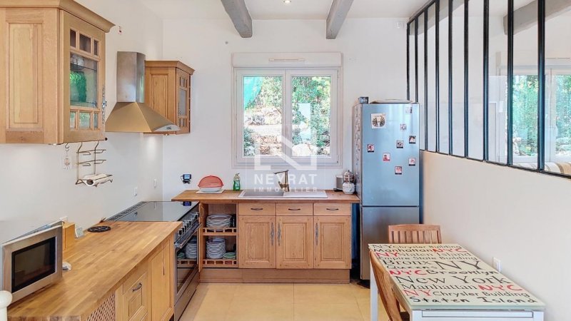 Cette villa avec de très belles finitions et prestations se compose : au rez de chaussée, une entrée, un spacieux et lumineux salon séjour avec poêle à bois, plafond cathédrale et poutres apparentes, cuisine équipée, deux chambres, le tout donnant sur une superbe terrasse.