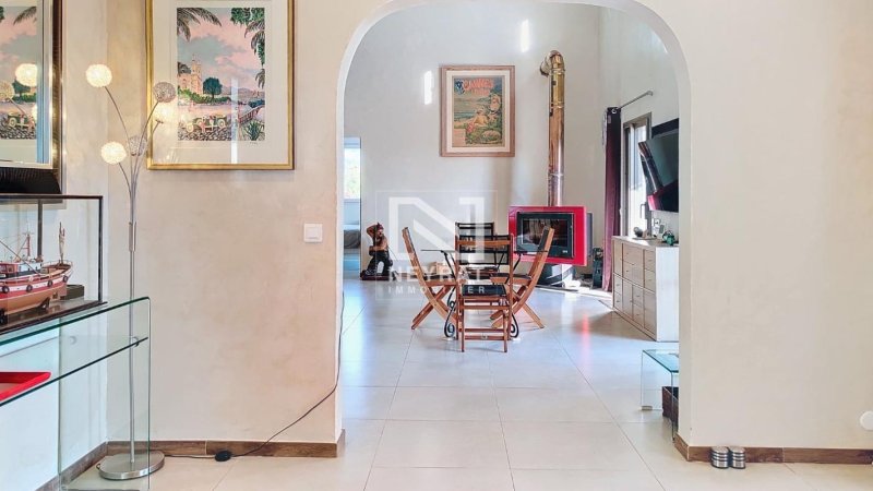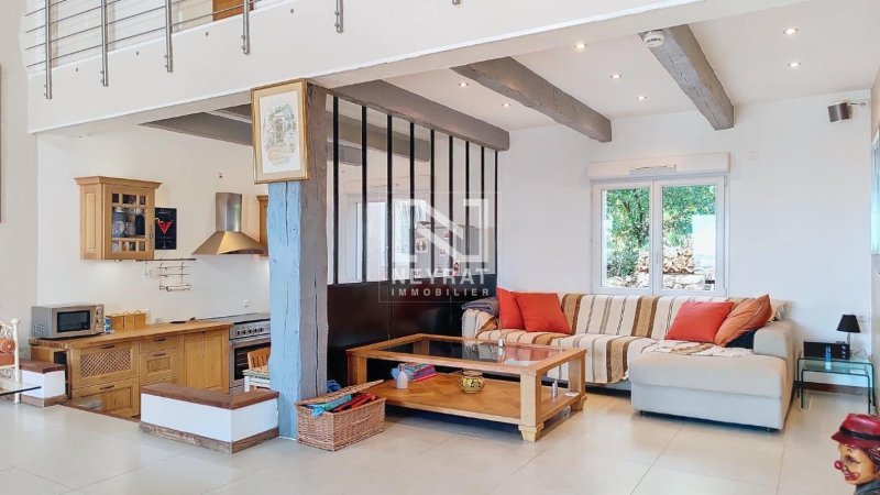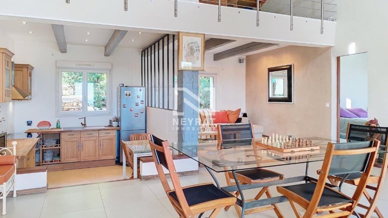 Cette villa avec de très belles finitions et prestations se compose : au rez de chaussée, une entrée, un spacieux et lumineux salon séjour avec poêle à bois, plafond cathédrale et poutres apparentes, cuisine équipée, deux chambres, le tout donnant sur une superbe terrasse.