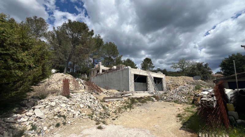 État actuel : Rez-de-chaussée structurellement achevé, gros oeuvre de l'étage à terminer (élévation et toiture).