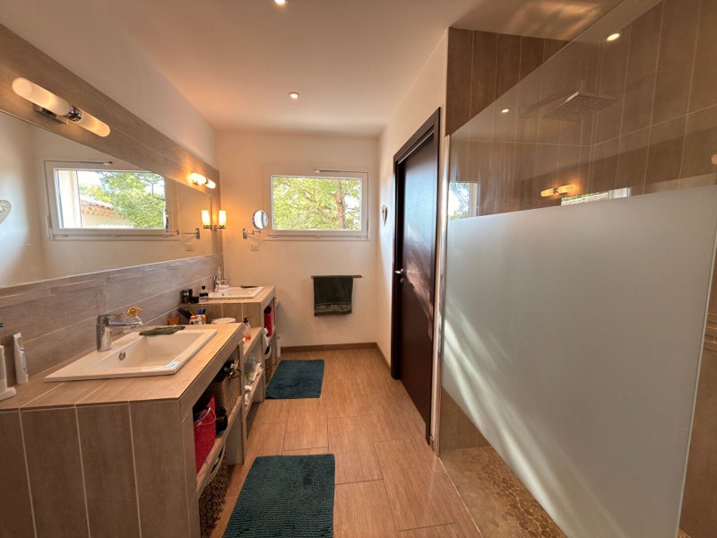 L'intérieur de la villa est aménagé avec soin, comprenant une cuisine entièrement équipée, un séjour exposé plein sud, et un chaleureux insert dans la cheminée. Vous trouverez également une salle de bain, 3 salles d'eau, tous conçus pour votre confort.