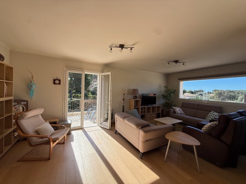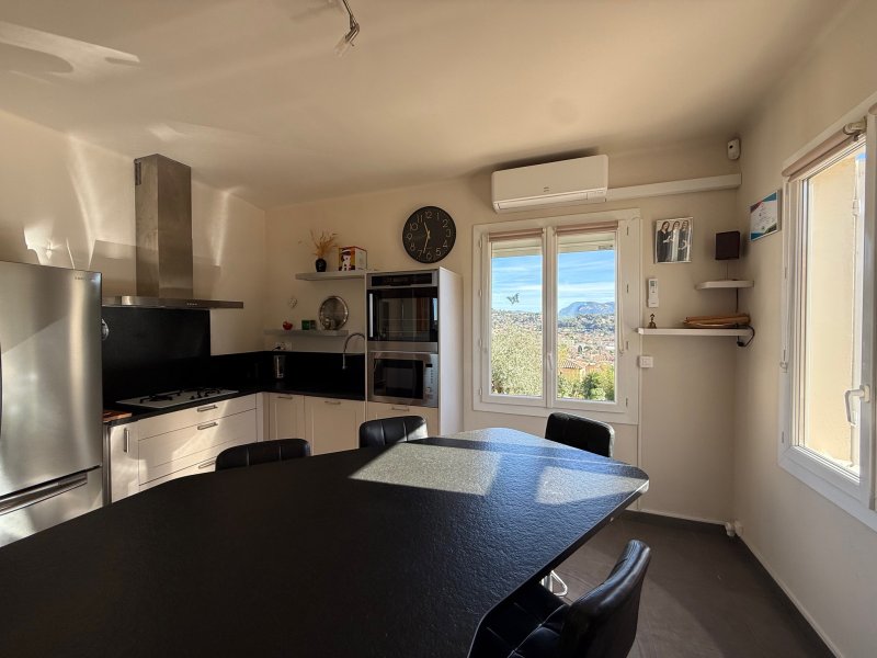 En exclusivité chez WEBER Immobilier - Entre le village d'Ollioules et le Domaine de Terrebrune en direction de Sanary sur Mer, située au calme avec vue dégagée sur les collines environnantes et aperçu mer, villa de 206 m2 aux prestations soignées entièrement rénovée à partir de 2015 avec tout le confort actuel, notament la climatisation réversible. Dans sa partie principale, la surface habitable de 153 m2 se compose comme suit : une entrée avec vestibule, deux chambres (13 et 12 m2), salle de bains, rangements. Une buanderie de 11 m2 et garage de 19 m2. Cuisine équipée de 26 m2 ouverte sur un lumineux séjour-salon en L de 45 m2 avec cheminée à granulés. Terrasses avec vues. Espace nuit pour deux chambres de 10 m2, dressing et une salle d'eau. En annexe pour louer en saisonnier ou recevoir famille et amis, un appartement indépendant type 3 de 53 m2 en rez-de-jardin avec séjour-cuisine, salon, deux chambres et une salle d'eau-wc. Possibilité de créer facilement une communication intérieure avec la partie principale. Très beau terrain clos et entièrement paysager irrigué par le Canal de Provence, d'une surface utile d'environ 1600 m2. Piscine traditionnelle carrelée et sécurisée par un volet de 3,20 x 6,50 m. Nombreux stationnements.