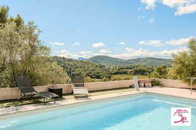 En descendant une restanque, on découvre la piscine entourée d'espaces permettant l'installation de plusieurs transats.