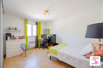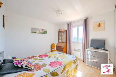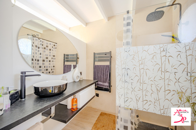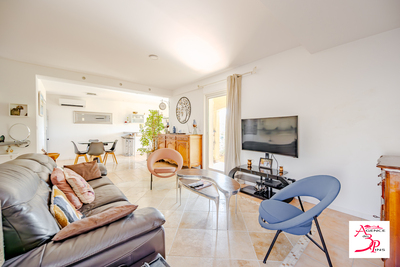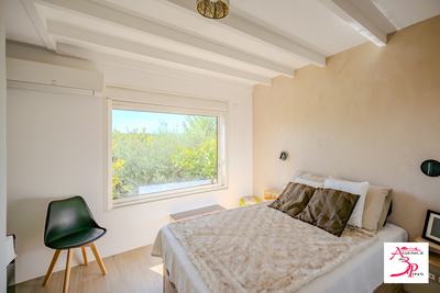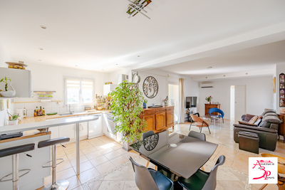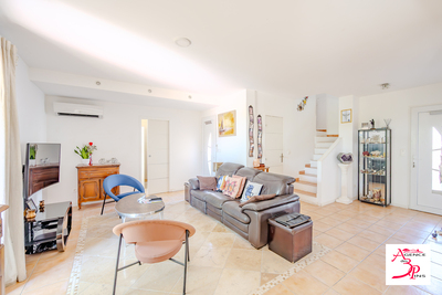 Cette maison entretenue bénéficie d'équipements modernes tels que des baies à galandage et une climatisation réversible.