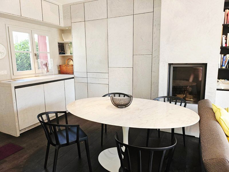 Large maison ""Hunière"", entièrement rénovée avec des matériaux de grande qualité, dans un style contemporain. avec au rdc: cuisine ouverte - salon avec cheminée, donnant sur un jardin exposé ouest. au 1° étage, une chambre parentale avec salle de douches, une autre chambre avec salle de douches.~climatisation, excellente isolation . Amarrage: 12 M. ~parking.