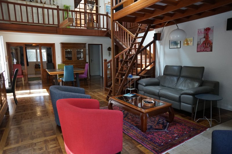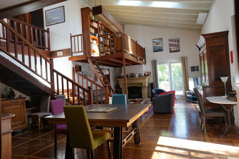 Le rez de chaussée de 129m2 est composé d'un salon de 52m2 avec demi mezzanine ouverte, d'une cuisine indépendante, d'un cellier/buanderie, d'un bureau/salle d'archives, d'une salle d'eau et d'un petit salon.