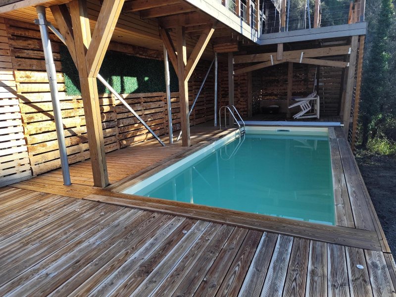 A l'extérieur , les espaces ont été pensés pour profiter pleinement du cadre: Piscine 6x2,50 au chlore, idéale pour les beaux jours. Terrasse exposée plein sud . Atelier, parfait pour le bricolage, pompe a chaleur gainée réversible