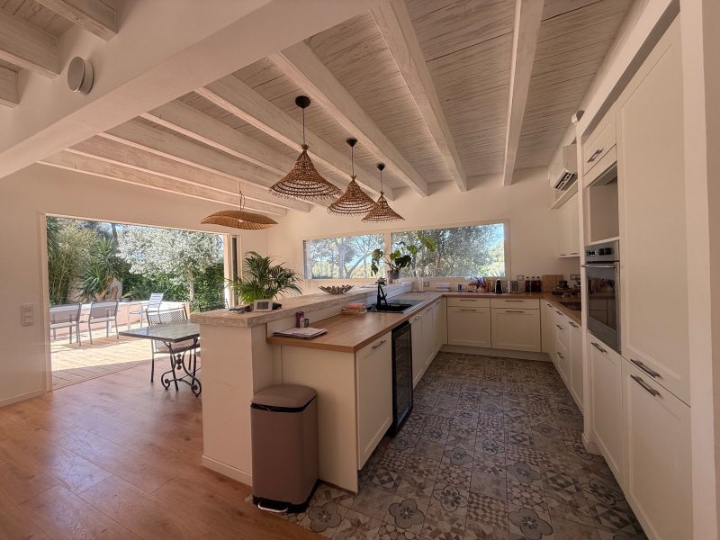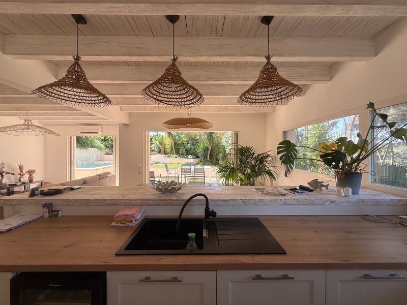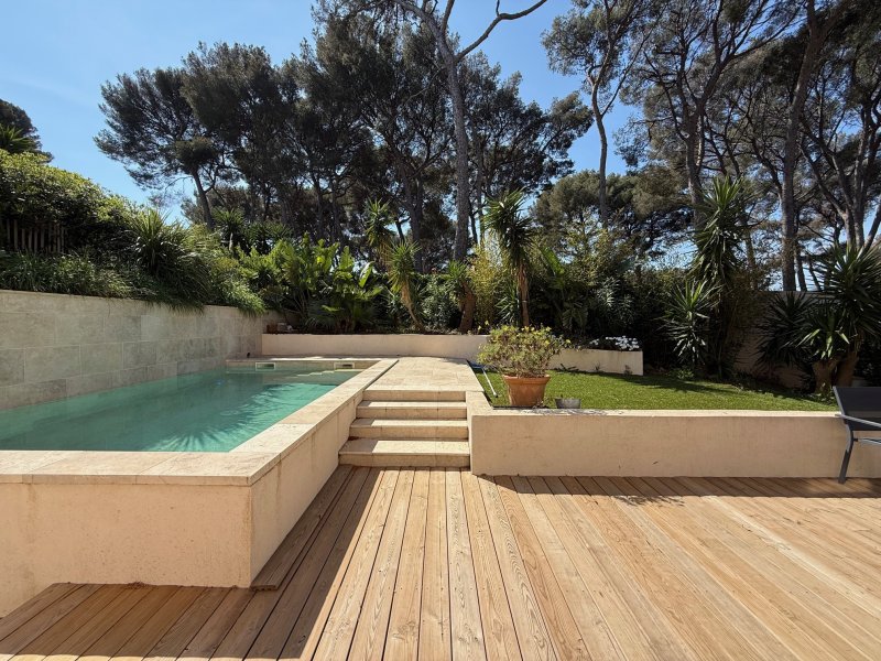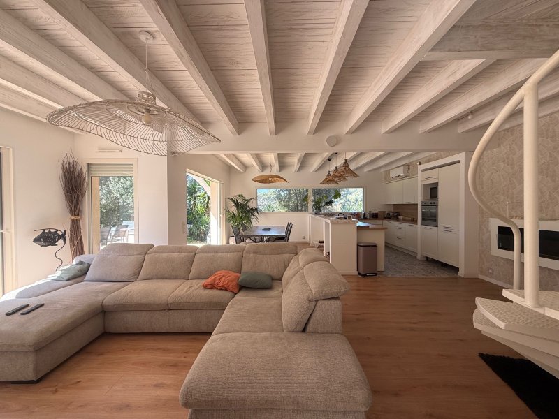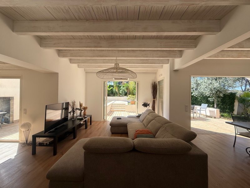 Entre la plage de Portissol et la plage de Beaucours, villa neuve de 122 m2 entièrement climatisée offrant une très belle pièce de vie de 54 m2 avec cuisine équipée, baies vitrées à galandage sur terrasse et jardin. 4 chambres dont une 1 chambre en rdc à cloisonner avec salle d'eau, et à l'étage 3 chambres dont 1 avec salle d'eau. Les deux autres chambres se partagent une salle de bains. Balcon avec vue piscine et jardin. Garage à motos et vélos. Local technique, stationnement sur terrain de 400 m2 clos et arboré avec piscine traditionnelle carrelée.