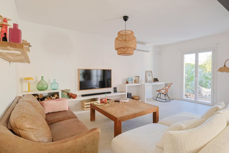 Au rez-de-chaussée, un vaste espace de vie de 60 m² s'ouvre sur l'extérieur, baigné de lumière grâce à sa double exposition Est/Ouest. La cuisine équipée s'intègre avec sobriété et fonctionnalité à la pièce principale, tandis qu'une chambre avec salle d'eau et une buanderie complètent ce niveau.