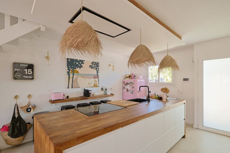 À l'extérieur, une terrasse en bois exotique prolonge la maison vers le jardin, dans une atmosphère apaisée. Le tout est complété par un stationnement privatif, une climatisation réversible et un poêle à bois apportant chaleur et authenticité.