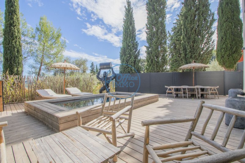 Venez découvrir cette magnifique villa contemporaine construite en 2022, offrant des prestations haut de gamme. Implantée sur un terrain de 788 m² en position dominante, elle profite d'un environnement calme et naturel, sans aucun vis-à-vis, et offre une vue dégagée sur les collines. La pièce principale, baignée de lumière grâce à une grande baie vitrée à galandage, propose un vaste séjour ouvert sur une cuisine moderne entièrement équipée. Cet espace convivial s'ouvre directement sur la terrasse et la piscine, créant une continuité naturelle entre l'intérieur et l'extérieur. Vous trouverez également une suite parentale confortable avec salle de bains, une buanderie fonctionnelle ainsi qu'un WC indépendant. À l'étage, la villa accueille une seconde suite parentale avec salle d'eau et un dressing entièrement aménagé. Un large dégagement, actuellement utilisé comme bureau ou dressing supplémentaire, peut être transformé très facilement en troisième chambre indépendante selon vos besoins. L'extérieur a été conçu comme un véritable lieu de détente : un terrain plat et clôturé, une piscine entourée d'une spacieuse plage en bois. La propriété dispose également d'un grand parking privatif pouvant accueillir jusqu'à six véhicules à l'intérieur du clos. Cette villa bénéficie d'une excellente performance énergétique. Elle est raccordée au tout-à-l'égout et à l'eau de ville, et dispose d'équipements de qualité tels que des menuiseries en aluminium double vitrage, des volets roulants électriques avec commande centrale, des climatisations réversibles, un escalier industriel sur mesure, une porte d'entrée design ou encore un chauffe-eau thermodynamique. Bénéficiant de la garantie décennale et de l'assurance dommage-ouvrage, cette propriété moderne et élégante séduira celles et ceux qui recherchent confort, luminosité et tranquillité dans un cadre privilégié. Un bien rare sur le secteur, à visiter sans plus tarder. Honoraires inclus de 2.09% TTC à la charge de l'acquéreur. Prix hors honoraires 479 000 . Classe énergie A, Classe climat A Montant estimé des dépenses annuelles d'énergie pour un usage standard : entre 348.00 et 470.00 sur les années 2021, 2022 et 2023 (abonnements compris). Les informations sur les risques auxquels ce bien est exposé sont disponibles sur le site Géorisques : georisques.gouv.fr. Votre conseiller L'office Immo : Michael Sorabella Agent commercial (Entreprise individuelle)
