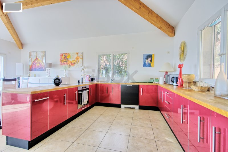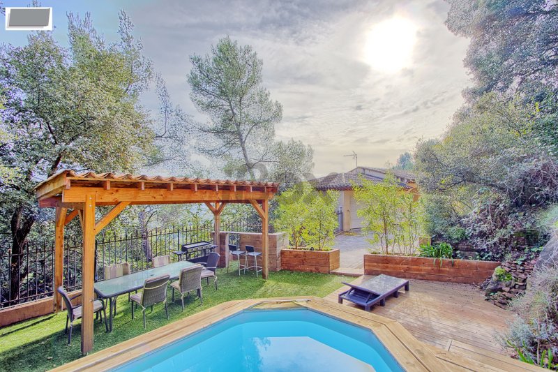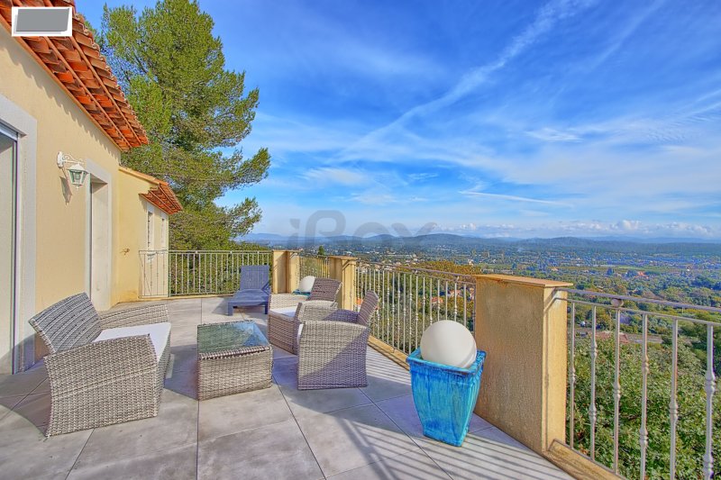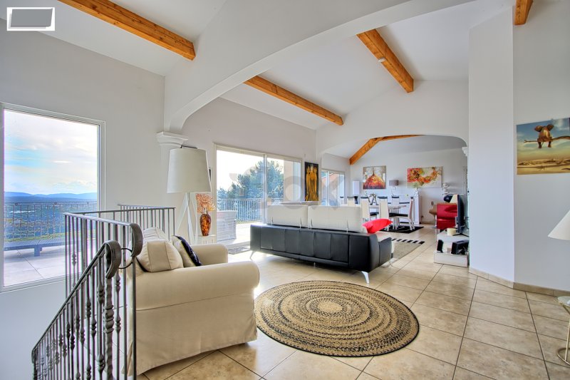 Sollies-ville, en vue dominante panoramique, villa T5/6 d'environ 230 m2 avec piscine, terrasses Entrée sur très vaste espace à vivre d'environ 100 m2 composé d'un salon séjour avec plafond cathédrale, cuisine US entièrement aménagée équipée avec cellier attenant, le tout avec accès par baies vitrées sur une très belle terrasse d'environ 30 m2, wc. L'étage inférieur dessert 2 suites parentales avec douche et 1 suite parentale avec baignoire, dressing dans toutes les chambres, toutes les suites donnant sur une terrasse couverte d'environ 30 m2. Sur ce même niveau, une salle de sport d'environ 30 m2 peut éventuellement offrir une 4ème chambre, cave. Grand garage de 30 m2 environ, sauna. Pour les extérieurs, le terrain de 1000 m2 en restanques, dispose d'une petite piscine hors sol avec un espace terrasse couverte. Portail électrique A voir rapidement