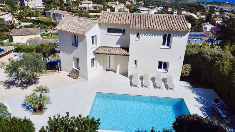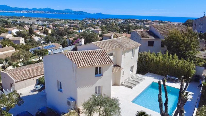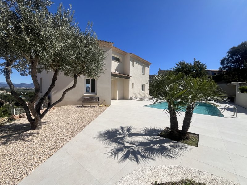 Dans un secteur recherché, à 2 pas du centre-ville, Confortable villa provençale entièrement rénovée en 2025, Offrant une vue mer à couper le souffle. Se Composant comme suit : une entrée donnant dans un séjour avec une très belle hauteur sous plafond grace à sa Mezzanine, cuisine ouverte, suite parentale de plain-pied. A l'étage, 2 chambres et une salle de bains. Accès sur un large balcon. Terrasse couverte permettant plusieurs espaces de vie. En rez de jardin, un appartement indépendant type 3 pièces idéal pour recevoir ou rapports locatifs saisonniers. Garage 3 voitures. Piscine et son Pool house. Terrain paysagé.