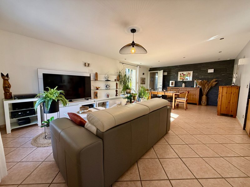 Baignée de lumière naturelle, cette demeure de plain-pied d'environ 92 m² s'articule autour d'une vaste pièce de vie de 53 m².