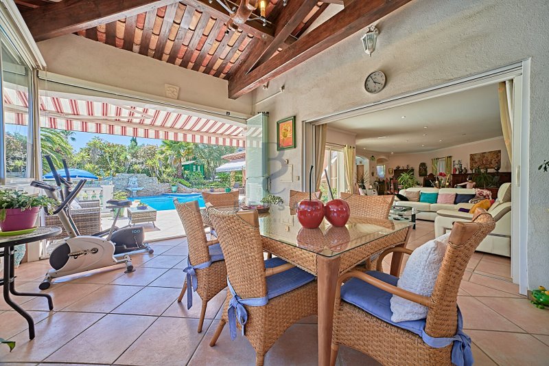 Dès l'entrée, vous découvrez un bel espace de vie ouvert, baigné de lumière grâce à de larges baies vitrées à galandage, créant une véritable continuité entre intérieur et extérieur avec un accès direct à la piscine et à une grande terrasse couverte avec cuisine d'été