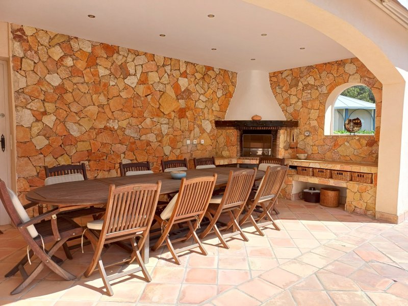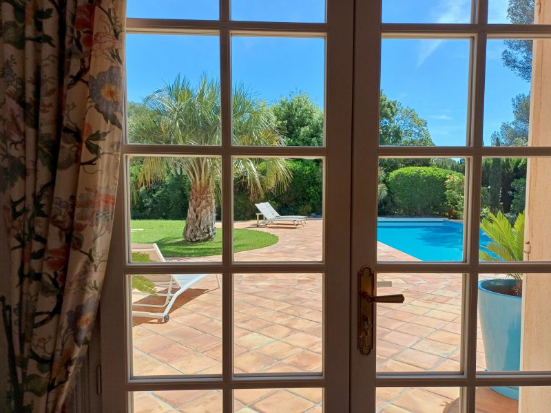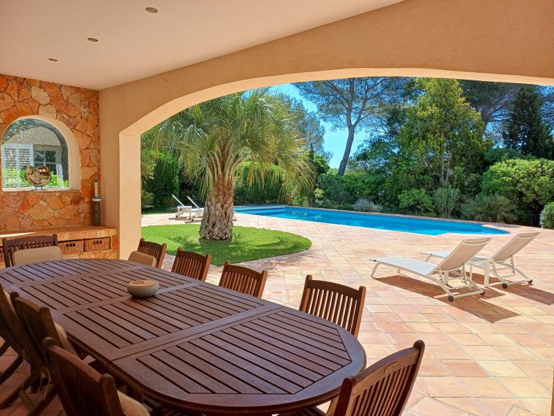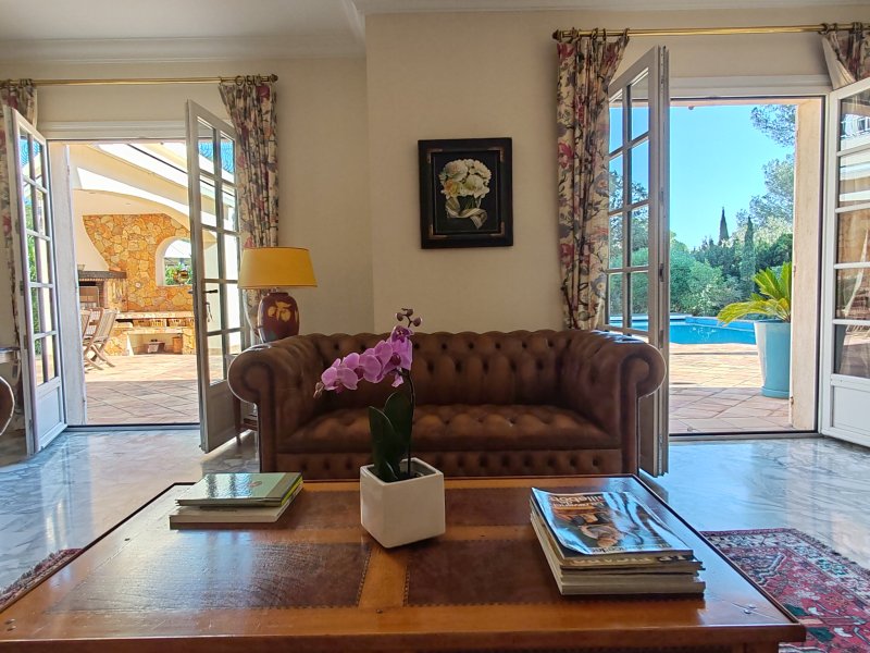 Nichée dans le prestigieux quartier des Plaines à Saint-Raphaël, cette superbe villa de 350 m2 offre un cadre de vie unique, alliant élégance, confort et prestations haut de gamme. Édifiée sur un terrain paysager de 1 340 m2, elle séduit par ses volumes généreux et ses matériaux nobles, notamment ses sols en marbre et ses menuiseries sur mesure. La villa principale dispose de quatre chambres spacieuses, dont une somptueuse suite parentale de plain-pied, offrant intimité et praticité au quotidien. Un vaste salon de 100 m2, agrémenté d'une cheminée, constitue le coeur de la maison, idéal pour recevoir famille et amis dans une atmosphère chaleureuse. La cuisine d'hiver de 18 m2, entièrement équipée, s'ouvre sur une terrasse couverte, parfaite pour profiter des beaux jours en toute convivialité. Un appartement indépendant de 80 m2, comprenant deux chambres, permet d'accueillir confortablement invités ou famille, ou d'envisager une location saisonnière. À l'extérieur, la piscine couverte et chauffée (10m x 5m) avec sa gloriette promet des moments de détente toute l'année. Un garage, un car-port, une cave à vin climatisée et un vide sanitaire complètent les annexes. Côté technique, la villa bénéficie d'un chauffage central par pompe à chaleur AIR-AIR, de la climatisation, d'un chauffe-eau thermo-dynamique, d'un arrosage automatique par forage, d'un système de vidéosurveillance et d'un groupe électrogène, garantissant confort et sécurité en toutes circonstances. Cette propriété rare, à l'abri des regards, offre un cadre de vie privilégié à proximité des commodités et des plages de Saint-Raphaël. Un bien d'exception à découvrir sans tarder. RETROUVEZ toutes nos annonces de biens à la vente, à la location à l'année, à la location de vacances ainsi que nos actualités directement sur notre site : www.af-immobilier.fr