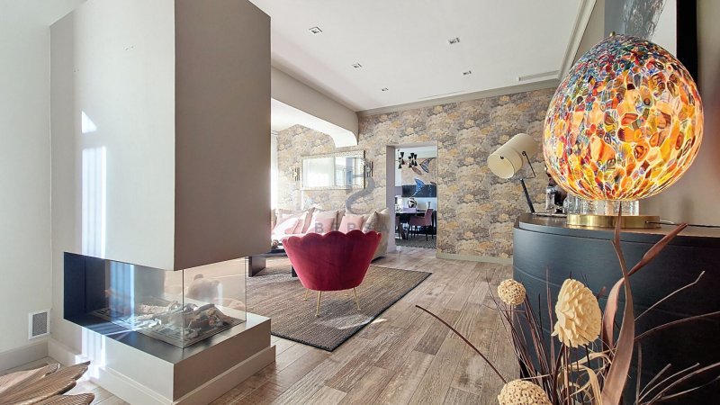 Derrière sa façade pleine de caractère, les volumes intérieurs bénéficient d'une belle hauteur sous plafond et d'une luminosité constante. Le séjour, organisé autour d'une cheminée moderne double face, propose une atmosphère chaleureuse et conviviale. La cuisine entièrement équipée s'ouvre sur la salle à manger, formant un espace de vie fluide et agréable.