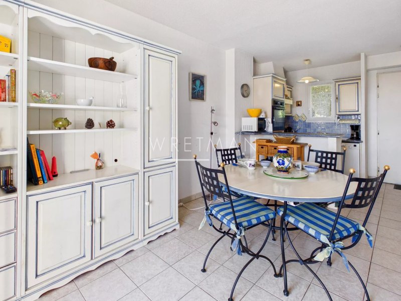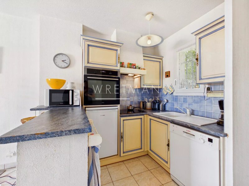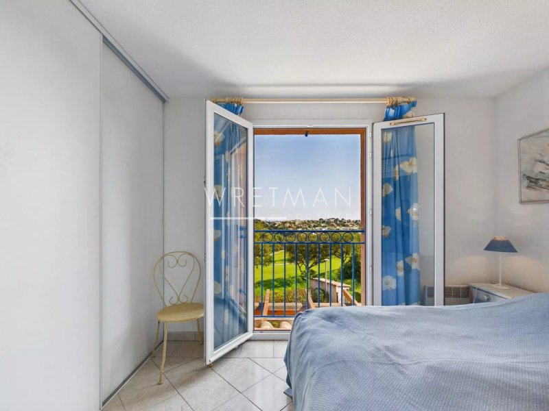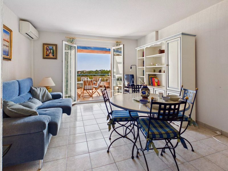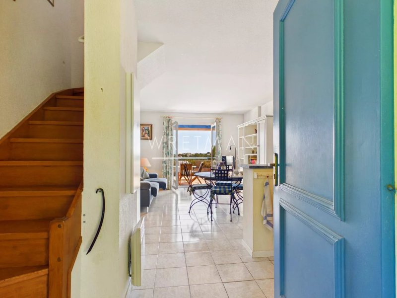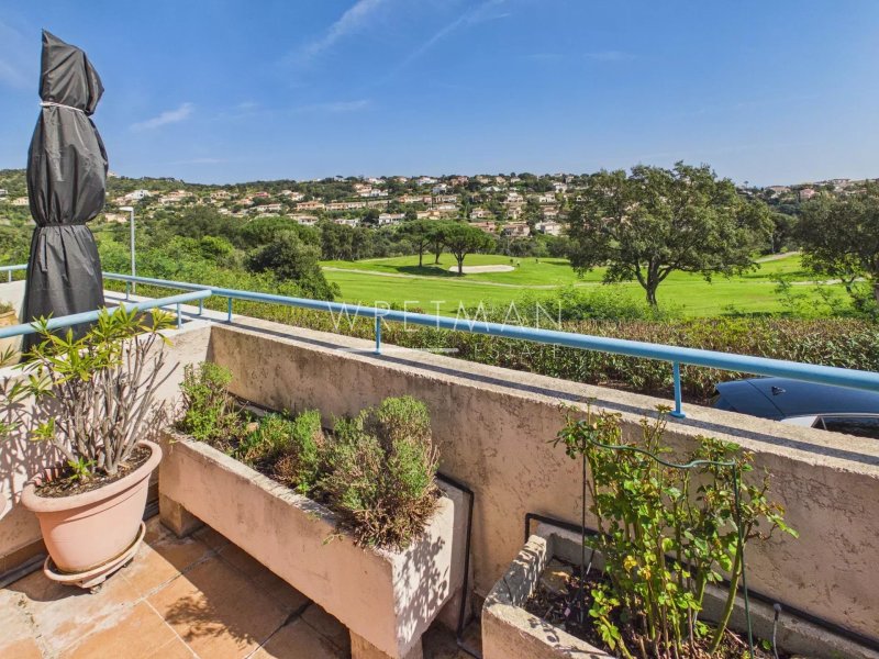 La villa se compose d'une cuisine ouverte sur le séjour donnant sur une grande terrasse de 20 m2 exposé sud-est avec une belle vue dégagée sur la verdure, le terrain de golf et un apercu de mer.