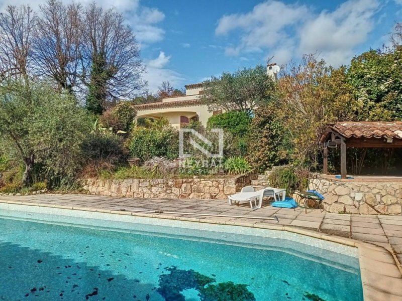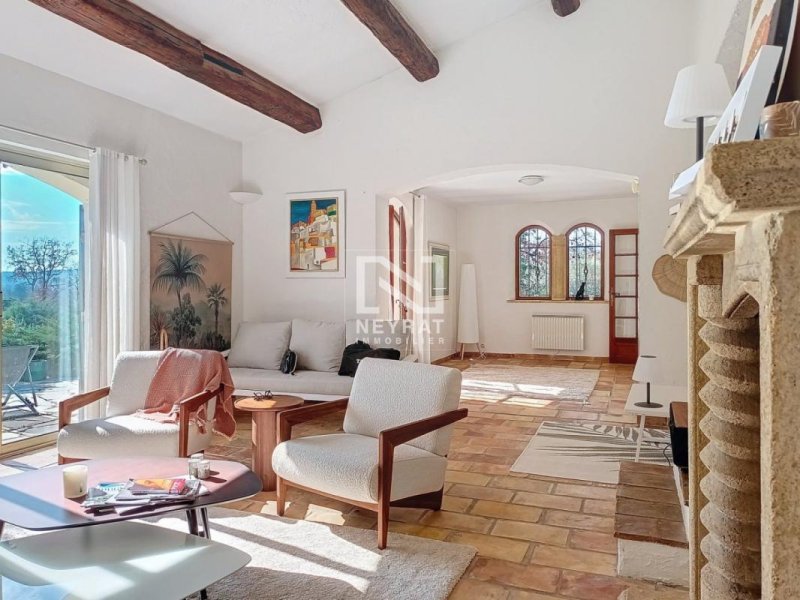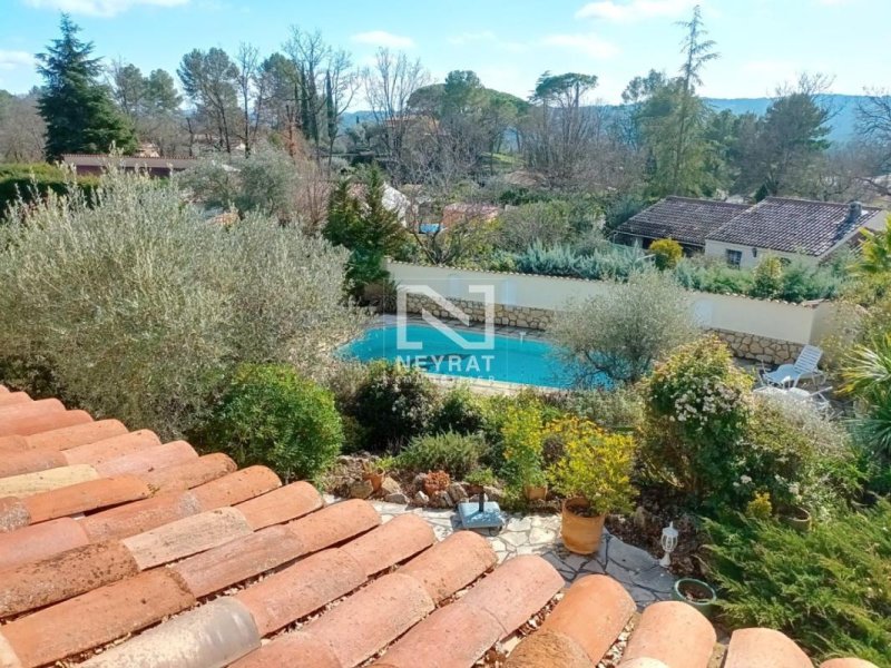Tourrettes : Superbe emplacement au calme absolu et proches commodités, très beau panorama pour cette belle villa provençale, 5 chambres, dont 4 de plain pied, grand séjour lumineux, 2 salles de bains, garage, buanderie, atelier, cave à vin. Magnifique espace piscine clos de mur, le tout dans un jardin méditerranéen avec vue dégagée. Belle maison de famille pleine de charme. Prestations de qualité. Bus scolaire à 20 m.