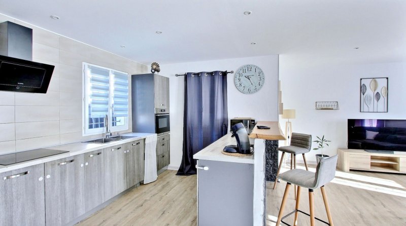 Élevée d'un étage, elle offre au rez-de-chaussée un bel espace de vie lumineux comprenant un séjour/salle à manger ouvert sur une cuisine moderne, complété par un cellier et des WC indépendants.
