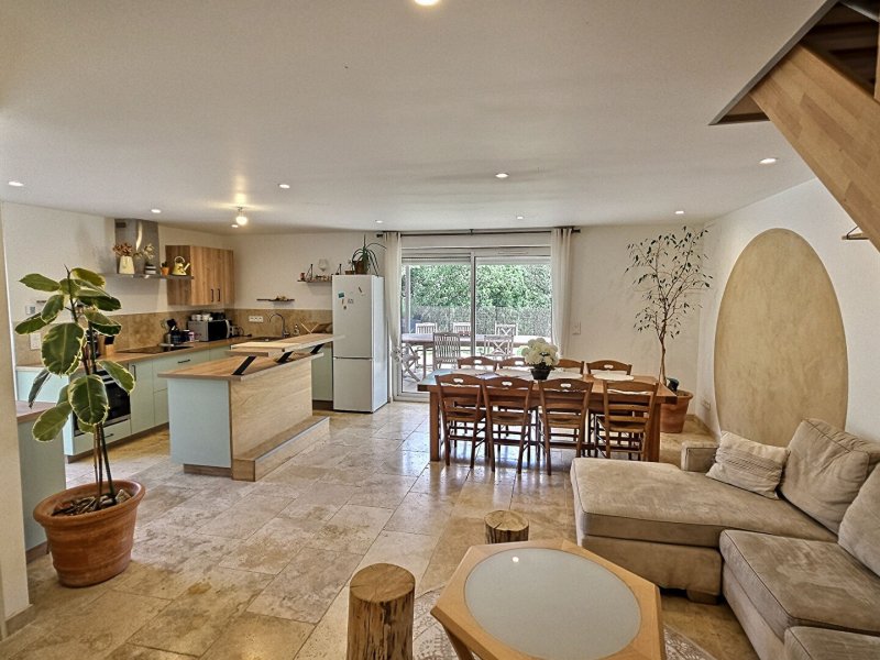 *D'une habitation principale de type 5 avec au rez-de-chaussée, son séjour lumineux et ouvert sur la terrasse, sa cuisine ouverte aménagée et équipée, son WC indépendant et son cellier/buanderie.