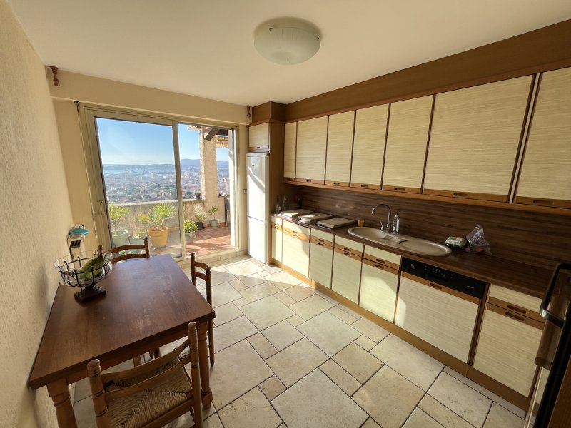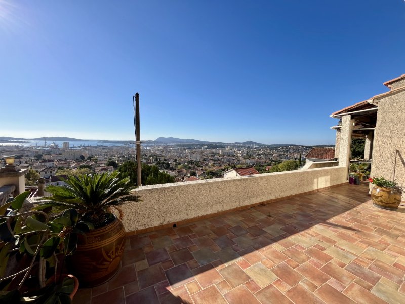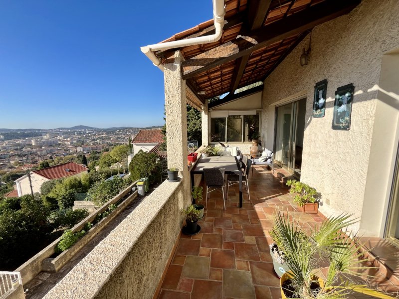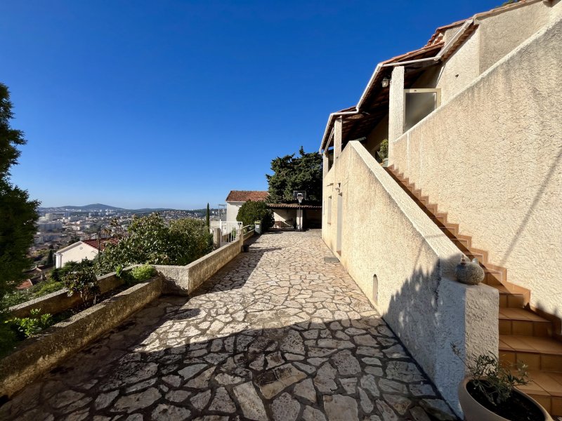 TOULON FARON - Idéalement située en positon dominante au bout d'une impasse au calme, maison traditionnelle construite en 1983 de type T4 et d'une surface de 130 m2 habitables, avec vue mer panoramique à 180o sur la ville et la rade de Toulon. Elle se compose d'une entrée, séjour, 3 chambres, cuisine indépendante, une salle de bains et une salle d'eau et 2 WC. Deux magnifiques terrasses exposées plein sud, un grand garage de 26 m2, une cave et deux parkings pour stationner les véhicules à l'entrée de la maison complètent le bien. Le tout sur un terrain en restanques d'une superficie de 1197 m2 avec de nombreux arbres fruitiers. Les commerces de Claret, la proximité avec les écoles et les transports ainsi que du centre-ville, font de cette villa un très bon compromis alliant campagne et ville.