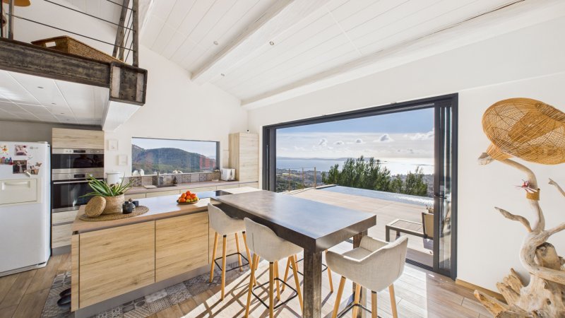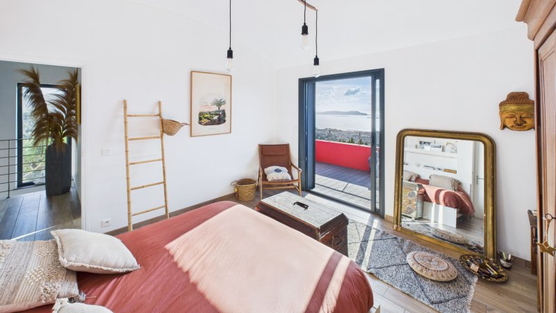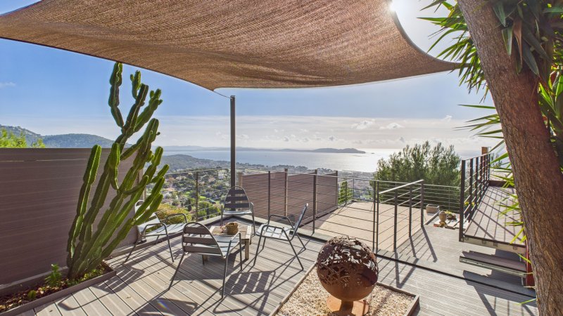 A vendre sur les hauteurs de Carqueiranne, villa d'environ 200 m2 offrant une vue mer panoramique exceptionnelle sur les îles d'Or et la presqu'ile de Giens. Baignée de lumière, la maison séduit par ses volumes, ses prestations de qualité et son atmosphère élégante. La pièce de vie s'ouvre sur une large terrasse et une piscine à débordement face à la mer. Cuisine ouverte contemporaine, 3 chambres dont une suite parentale avec terrasse solarium, T2 indépendant idéal pour recevoir, ascenseur, terrain de pétanque, atelier et grand abri voiture. Un bien rare, alliant confort, vue spectaculaire et art de vivre méditerranéen.