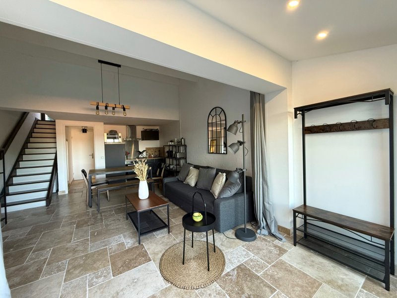 Quartier LA VIGIE - Très joli MAZET de type 02 pièces pour 41.10 m2 carrez entièrement rénové du sol au plafond. Il vous invite avec Terrasse, séjour ainsi qu'une belle cuisine US équipée, salle de douche à l'italienne et wc indépendant. A l'étage une vaste chambre donnant accès à un jardin VUE MER et PORT. TOUT A PIEDS ET RENOVE !