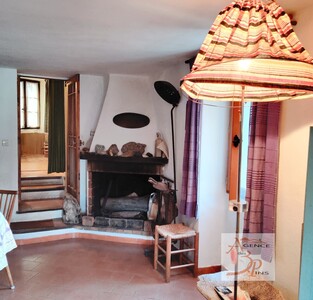 Une fois passé la porte d'entrée à l'encadrement en pierre, vous apprécierez les détails historiques (tomettes, poutres, cheminée, pierres