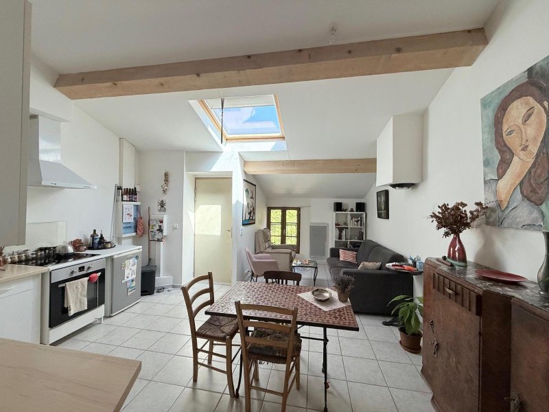 En R+1, un appartement T2 de 50m2 avec un accès indépendant, une entrée, une chambre, un grand séjour avec une cuisine ouverte et aménagée, une salle d'eau avec toilettes