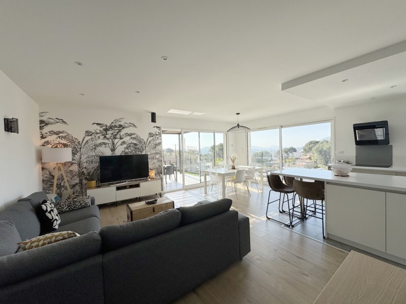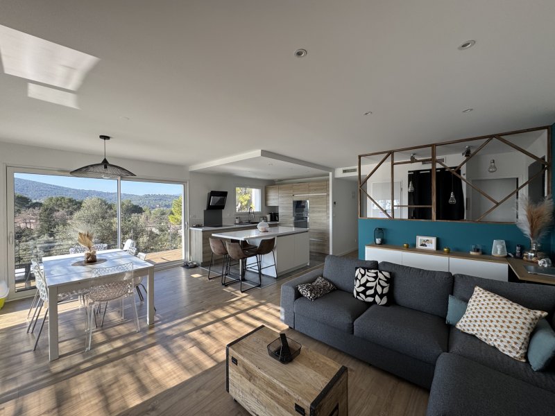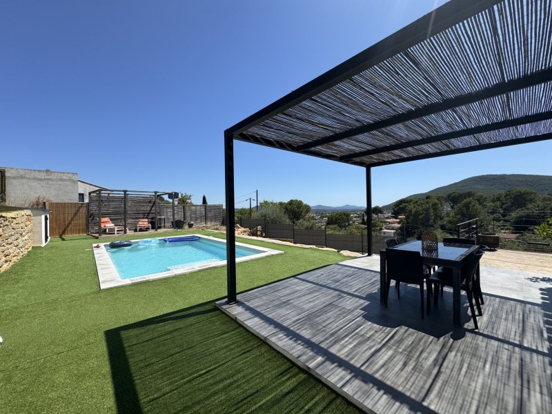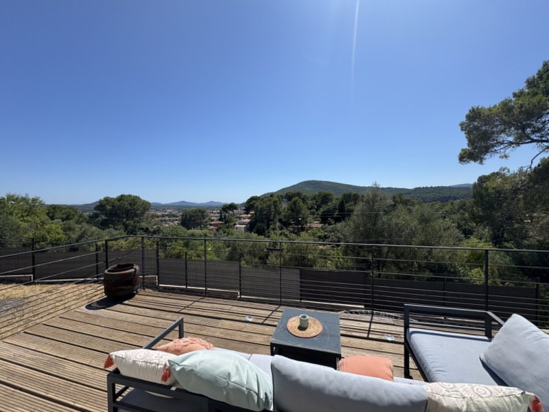 Cuers dans les hauteurs : Maison de 2017 d'environ 115m2 sur 1000m2 de terrain avec vue dégagée. Hall d'entrée, vaste séjour avec cuisine ouverte d'environ 50m2 ouvrant sur terrasse panoramique, terrasse avec jacuzzi, 1 suite parentale avec salle d'eau et dressing, 3 chambres, salle de bains avec wc, buanderie, cellier, wc séparé Terrasse couverte avec accés à une belle piscine au sel de 4x6 Grande cave en sous sol pour stockage Coup de coeur pour cette maison au calme absolu avec une vue panoramique sans vis à vis.